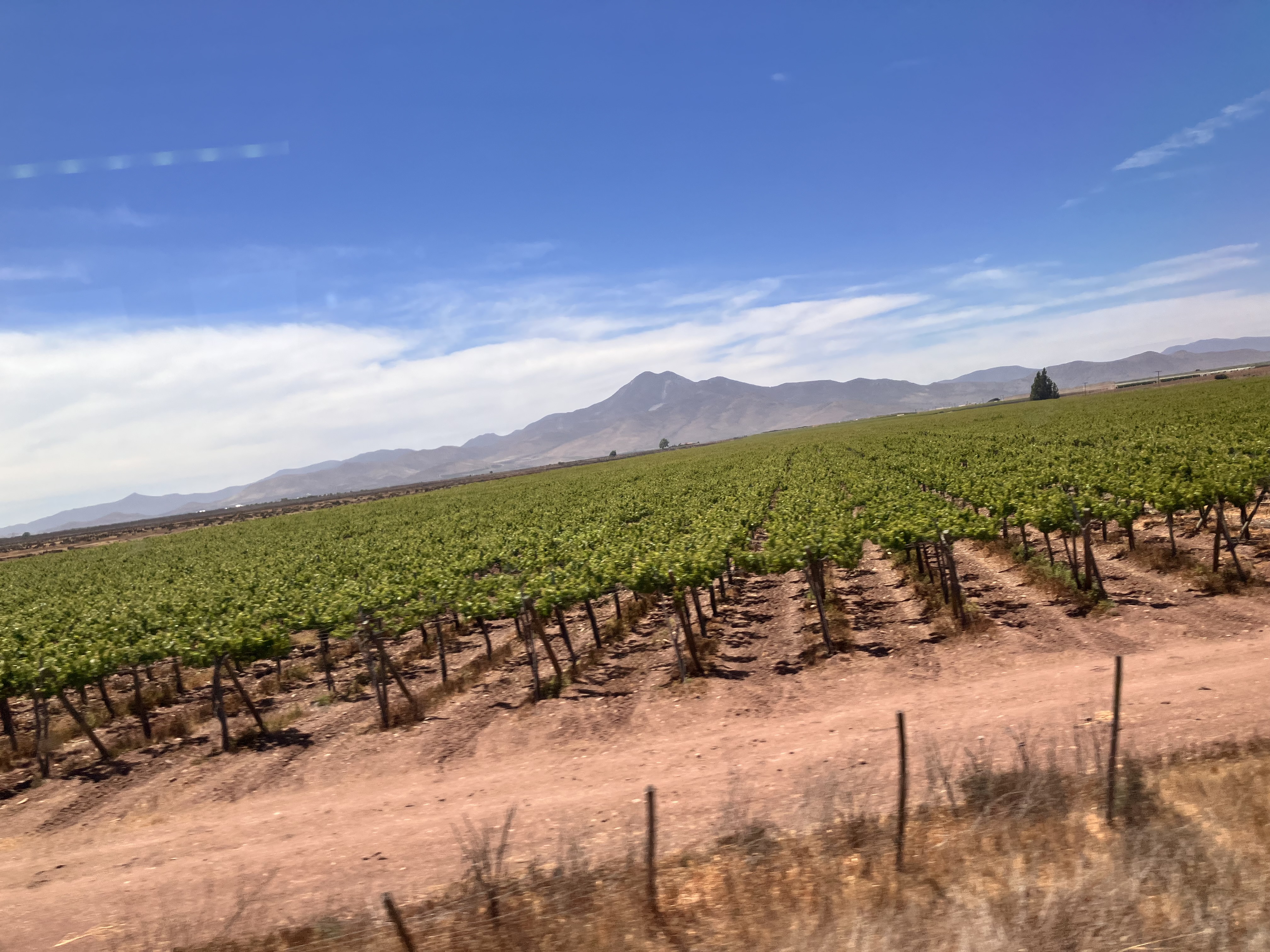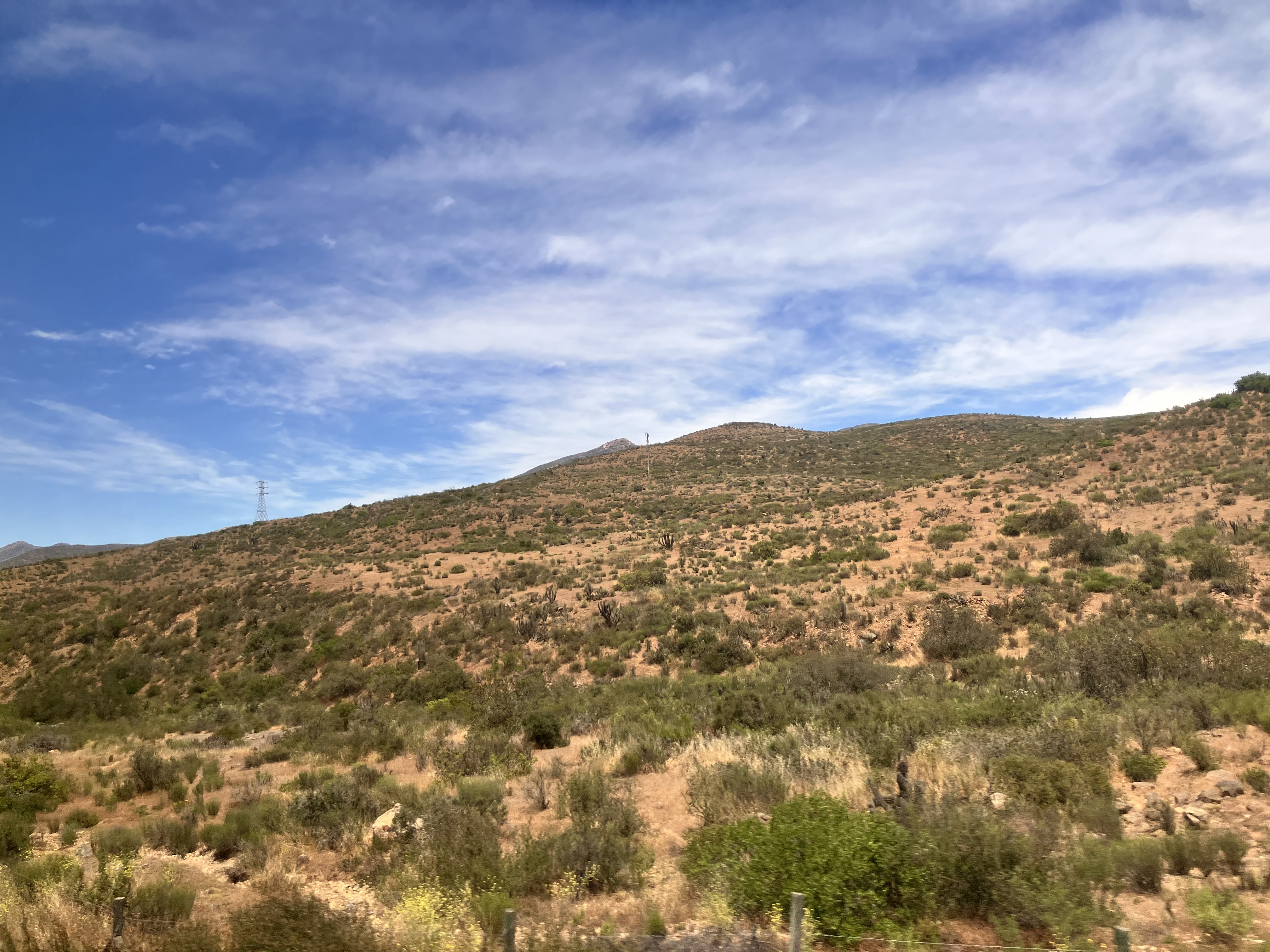 コキンボからサンチアゴへのバスの車窓はステップから地中海性気候へ変化する。葡萄畑も増えて来る。Desde la ventanilla del autobús de camino de Coquimbo a Santiago, el clima cambia de estepa a mediterráneo, y también aumenta el número de viñedos.