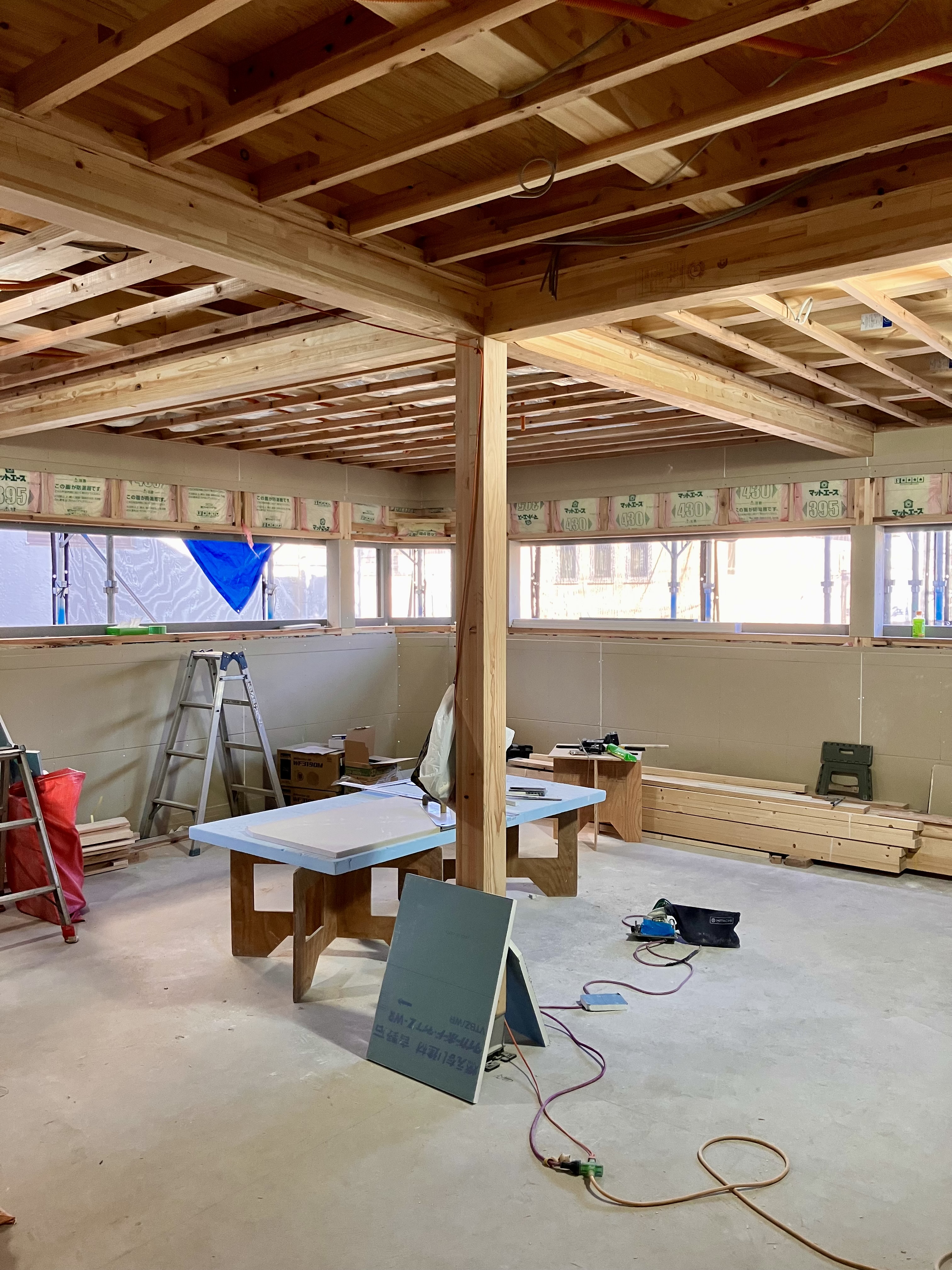 コロナの頃甲府で工事をしていた子供施設(オフィス、クリニック、ホール)の写真がやっと撮りおわった。木造で大きな空間を作り中央にトップライトを設けている。ホールはCLT折板構造の屋根である。クリニックは在来工法だ柱梁と構造用合板を同じ面で収める仕上げにして中央に一歩の鉄の柱を立てている。オフィスは周囲の開口部に柱を並べて屋根を支えている。 I've finally finished taking photos of a children's facility (office, clinic, hall) that was under construction in Kofu around the time of the COVID−19. It's a large wooden space with a skylight in the center. A hall has CLT folded-plate roofs. A clinic is constructed using traditional methods, with the columns and beams and structural plywood fitted flush with each other, and a single steel pillar in the center. The office roof is supported by pillars lined up around the openings.