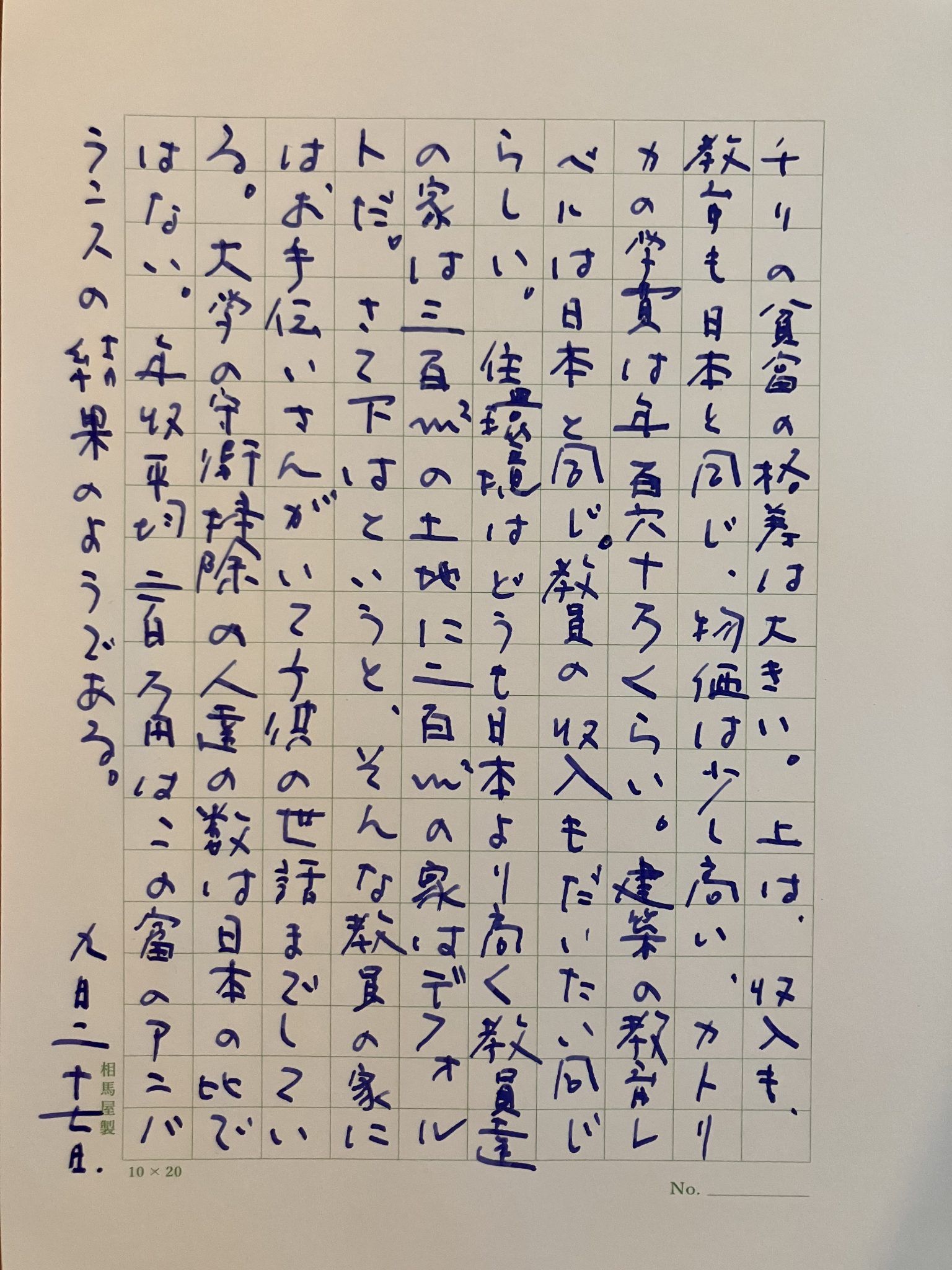昨日の授業で日本のビルの工事費は平米600万ペソ(100万円)だと言ったらドクターの学生がチリは5分の1くらいだと言っていた。消費者物価が日本よりすこし高いチリで建設物価が日本の5分の1は解せない。どっちが異常なのか?Ayer en clase, mencioné que el costo de construcción de un edificio en Japón es de 6 millones de pesos (1 millón de yenes) por metro cuadrado, y un estudiante de doctorado dijo わ en Chile es aproximadamente una quinta parte. No entiendo cómo los costos de construcción pueden ser una quinta parte de los de Japón en Chile, donde los precios al consumidor son ligeramente más altos que en Japón. ¿Cuál es anormal?