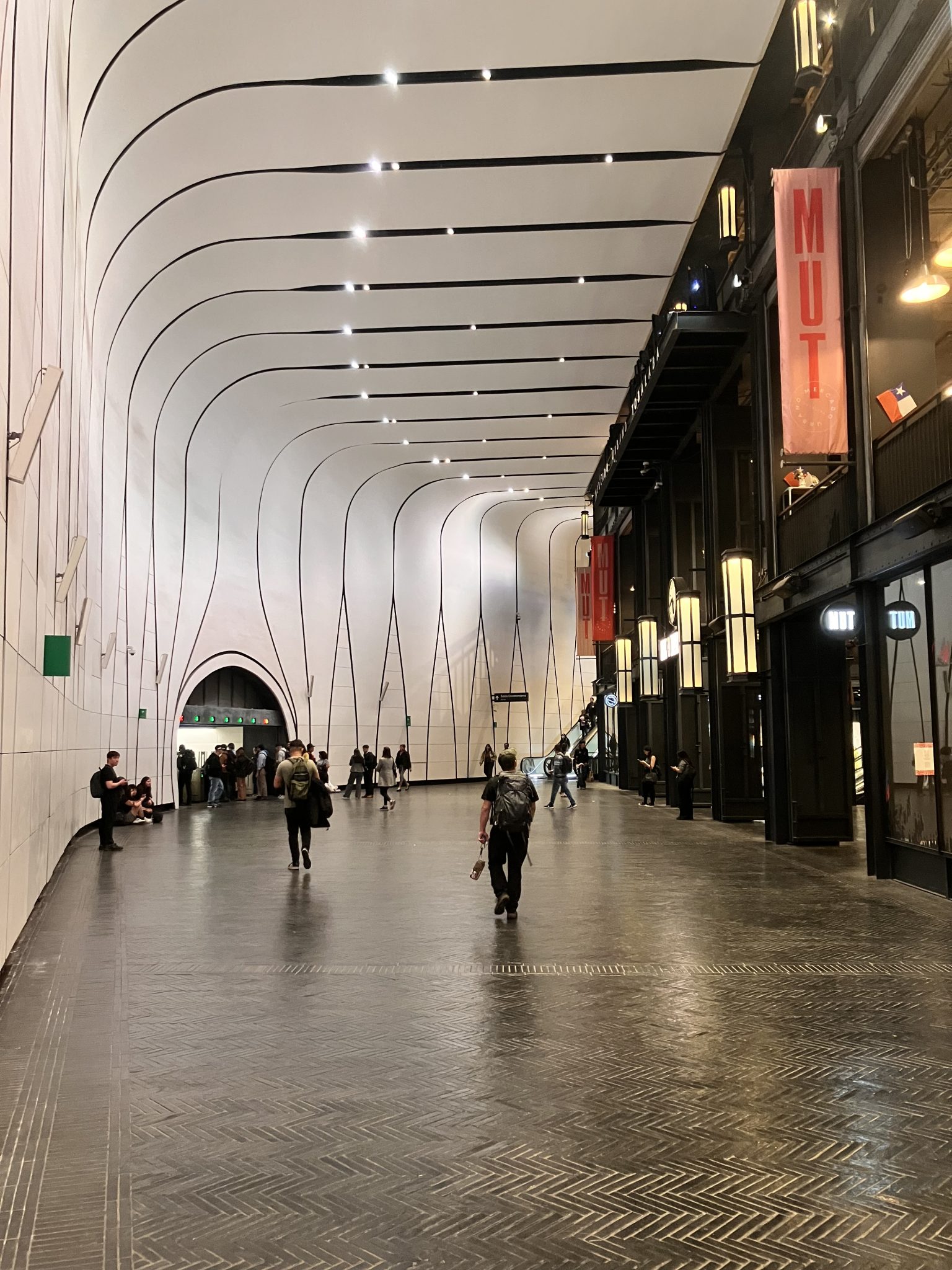地下鉄で二駅隣りのトバラバは大きなメルカド的モールに接続している。その空間映像は日本では見られない大きさだ。Tobalaba, a dos paradas de metro, está conectado a un gran centro comercial tipo mercado, cuya imagen espacial tiene una escala nunca vista en Japón.