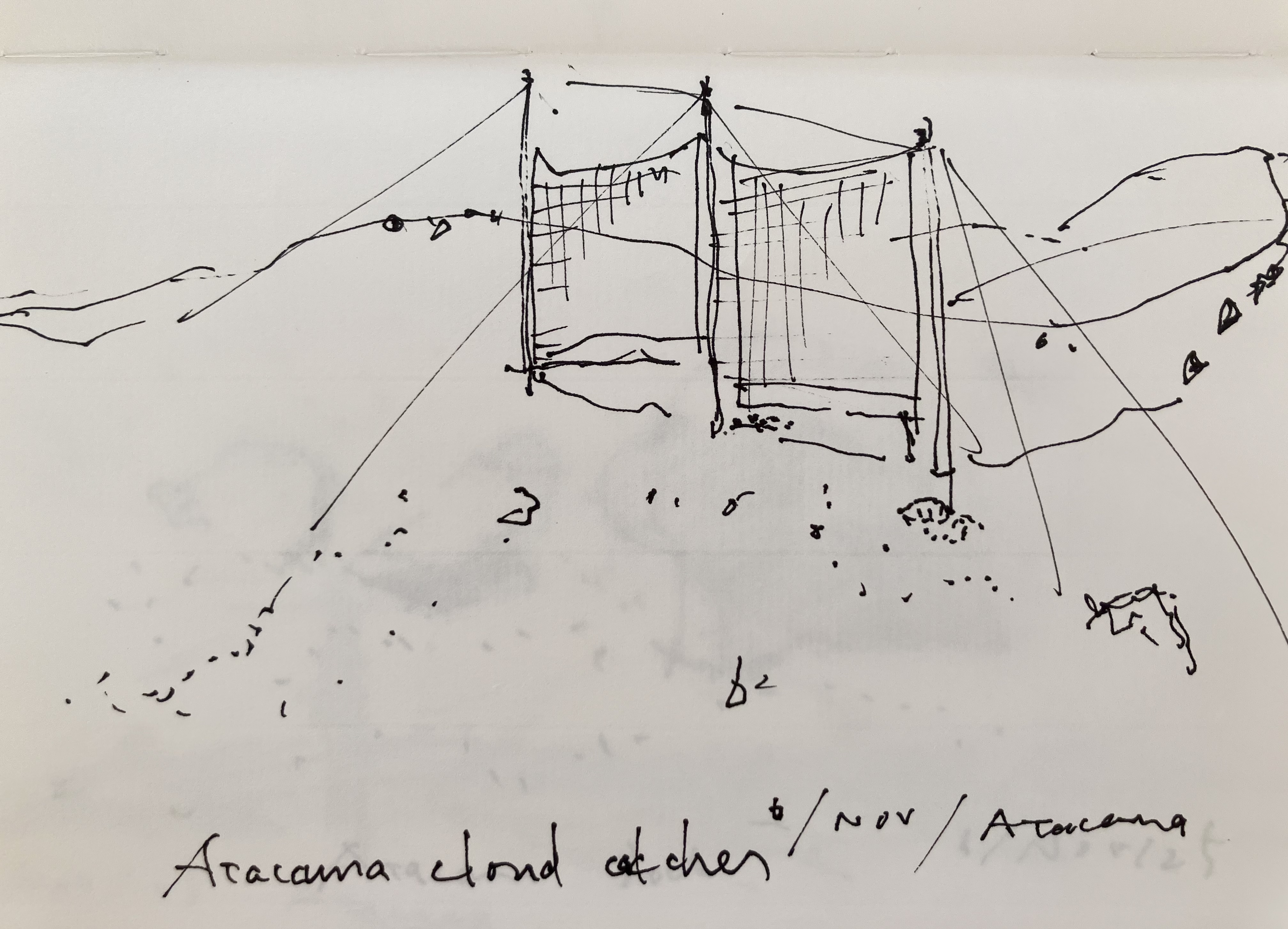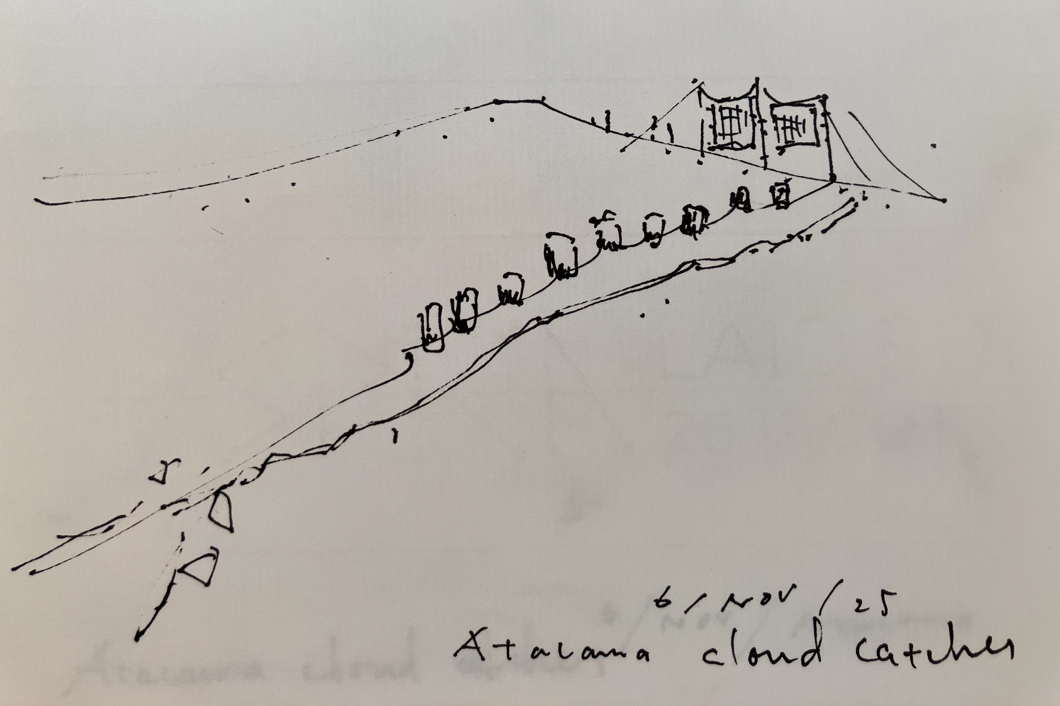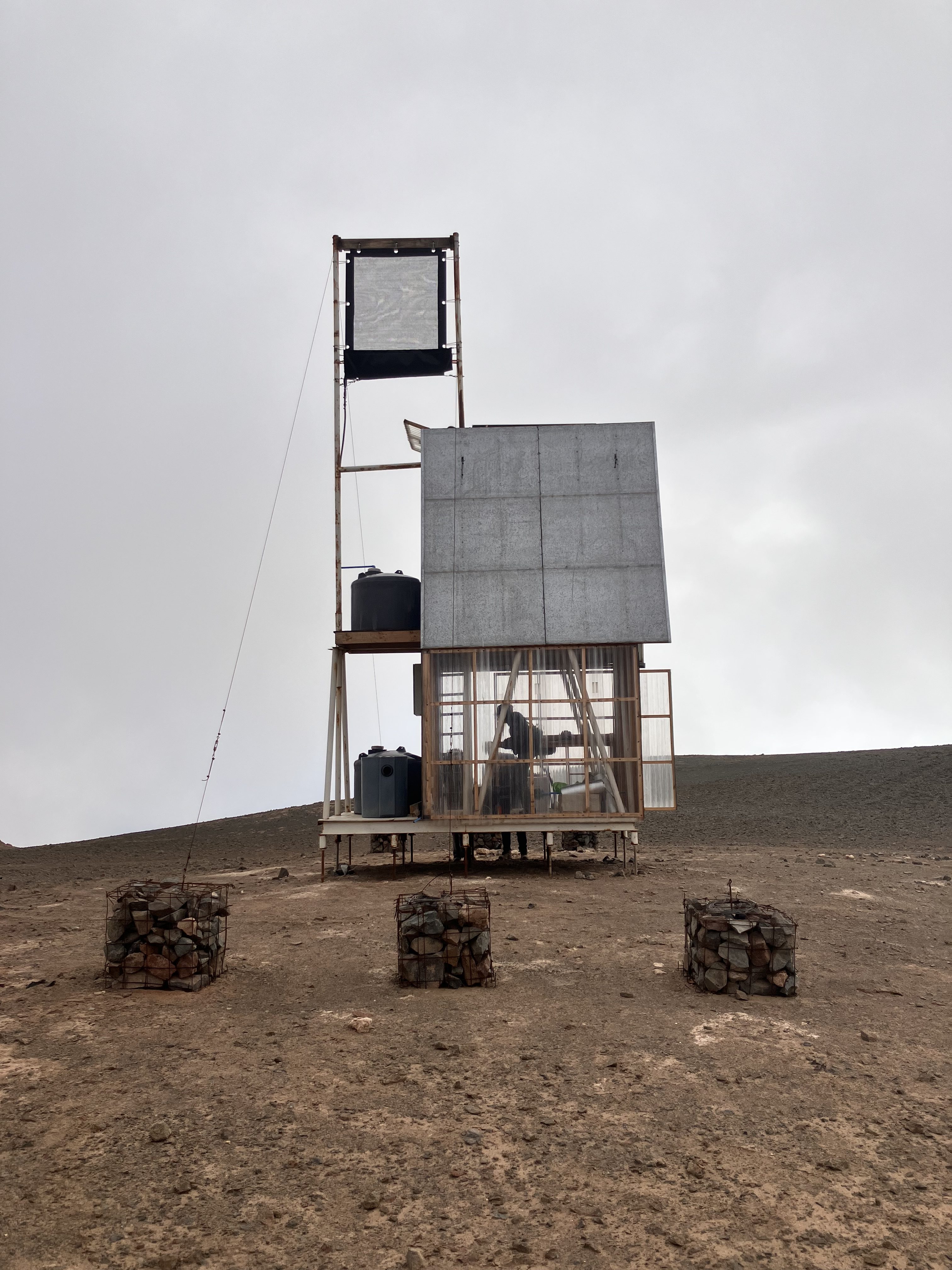 海沿いの都市イキケまで飛行機で飛ぶ。食材を買い、800メートルアタカマ砂漠を4wdで上がる。そこにカトリカのリサーチセンターがある。ホカチョという空気中の水蒸気から水をとる正方形の布で15000リットルの真水が常に準備されている。完全なオフグリッド施設である。We fly to the coastal city of Iquique, buy some food, and then drive 800 meters up into the Atacama Desert in a 4WD. There we find the Católica research center. 15,000 liters of fresh water is always kept on hand using a hokacho, a square piece of fabric that captures water from the air's moisture. It's a completely off-grid facility.