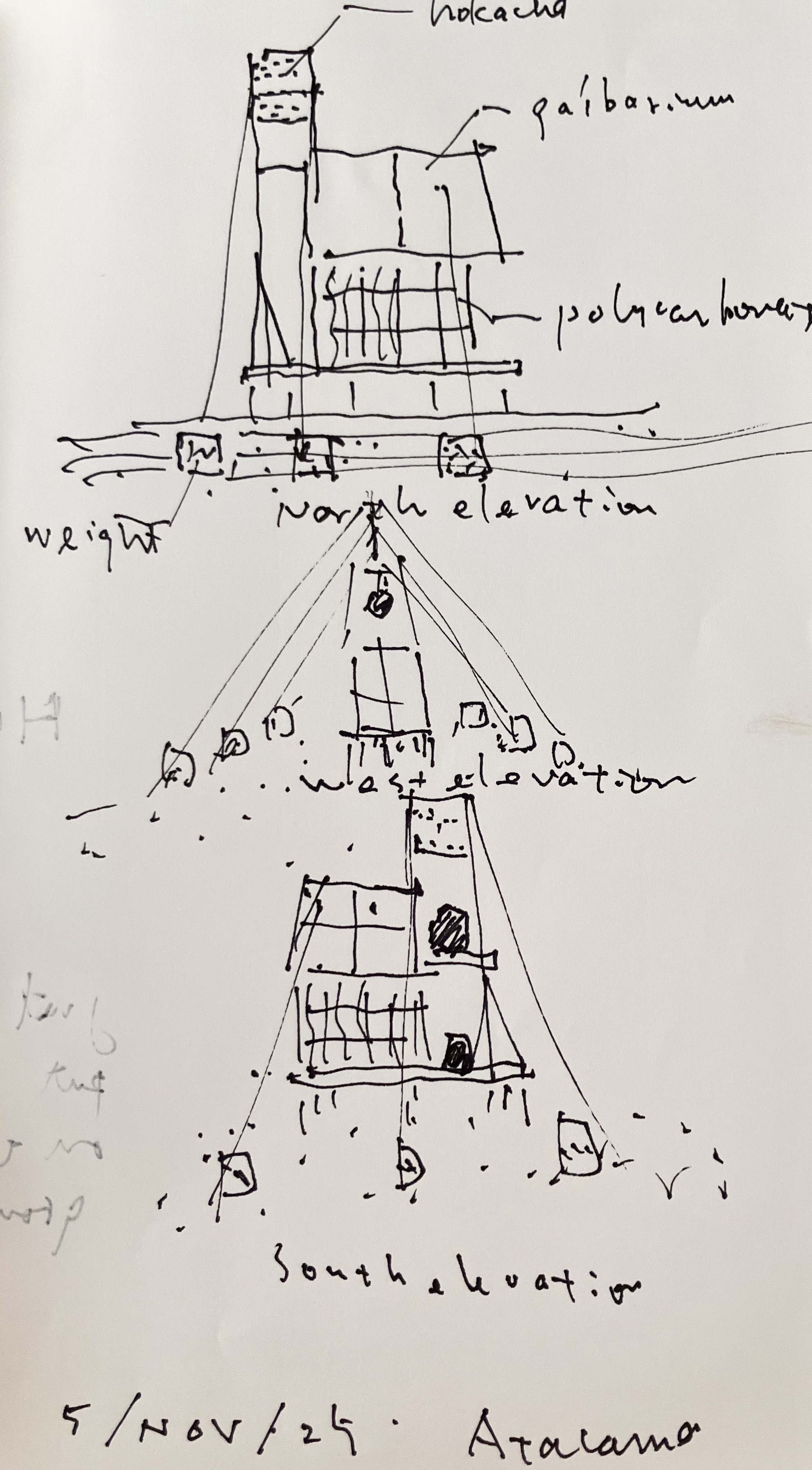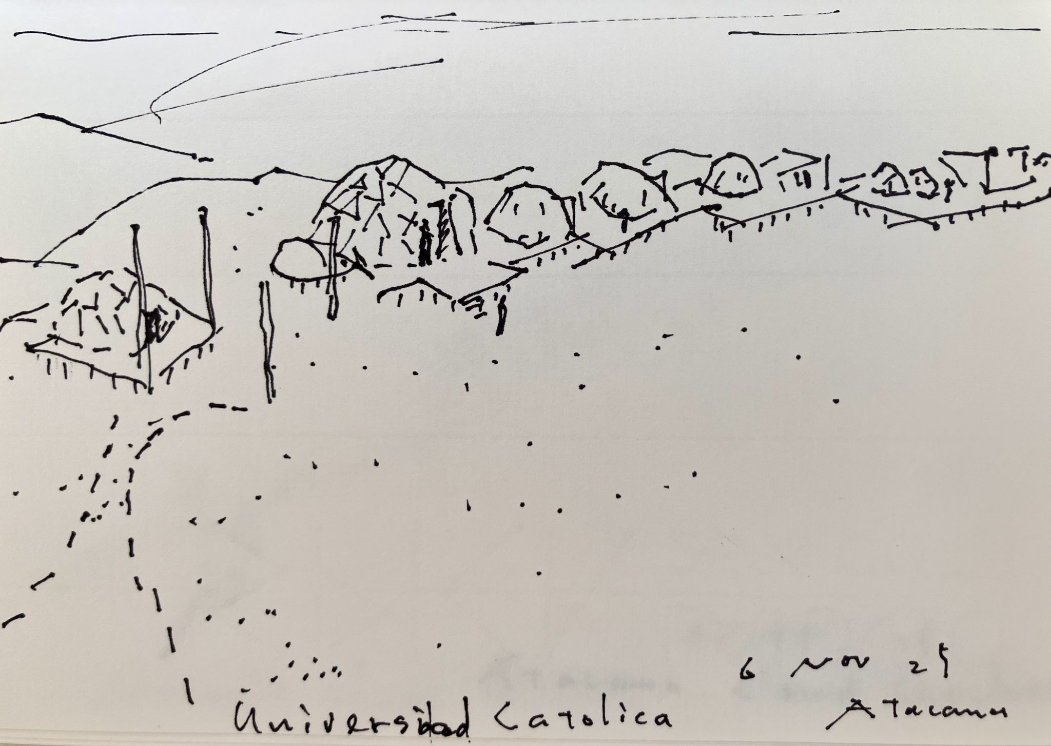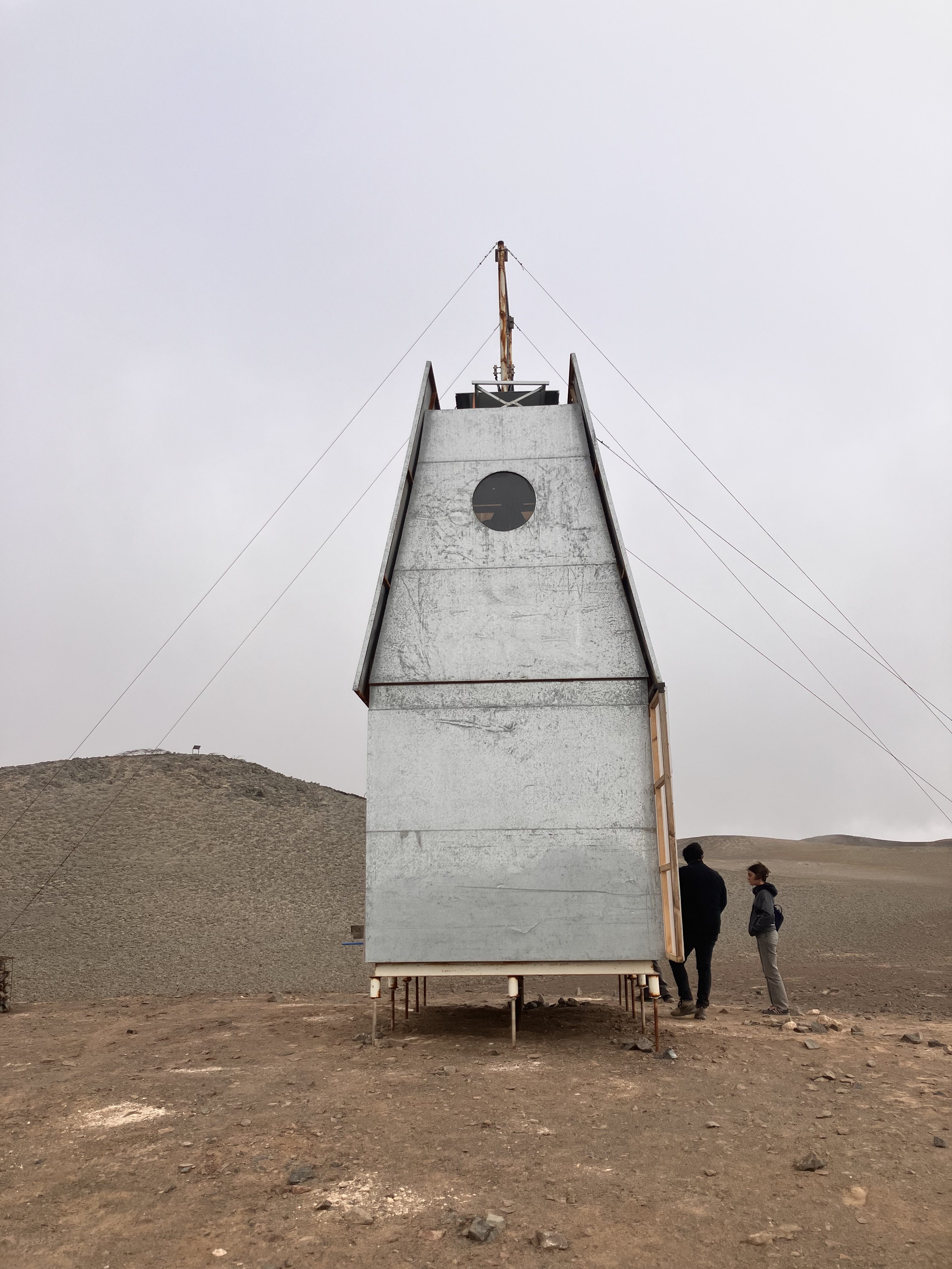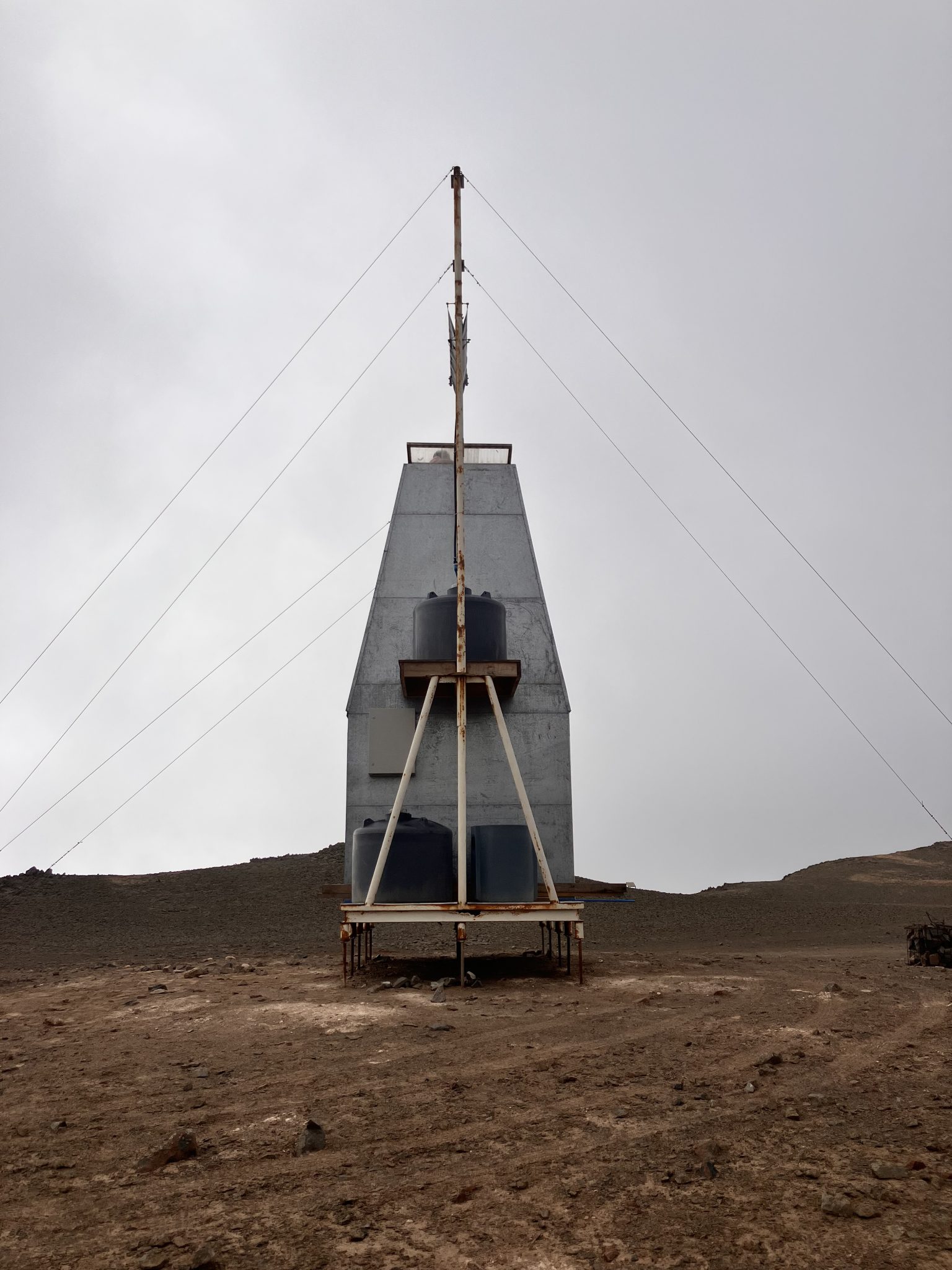 海沿いの都市イキケまで飛行機で飛ぶ。食材を買い、800メートルアタカマ砂漠を4wdで上がる。そこにカトリカのリサーチセンターがある。ホカチョという空気中の水蒸気から水をとる正方形の布で15000リットルの真水が常に準備されている。完全なオフグリッド施設である。We fly to the coastal city of Iquique, buy some food, and then drive 800 meters up into the Atacama Desert in a 4WD. There we find the Católica research center. 15,000 liters of fresh water is always kept on hand using a hokacho, a square piece of fabric that captures water from the air's moisture. It's a completely off-grid facility.