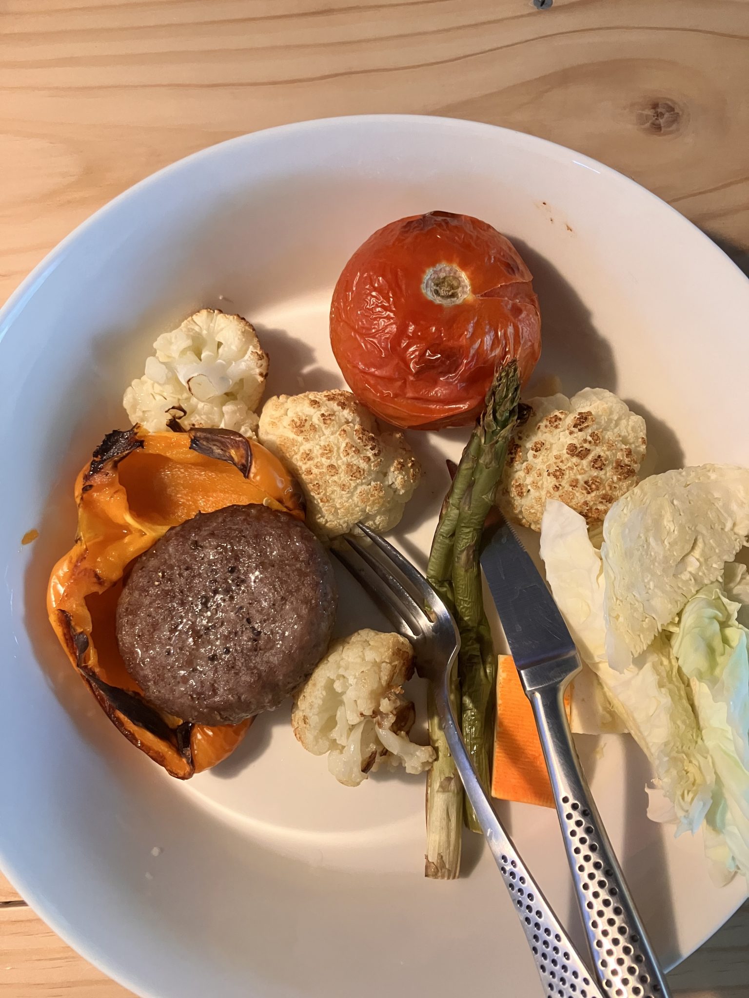 今晩はオーブンに野菜とハンバーグ肉をいれて250度で15分。これでも結構いける。Esta noche ponga algunas verduras y filetes de hamburguesa en el horno a 250 grados durante 15 minutos.Es muybien.