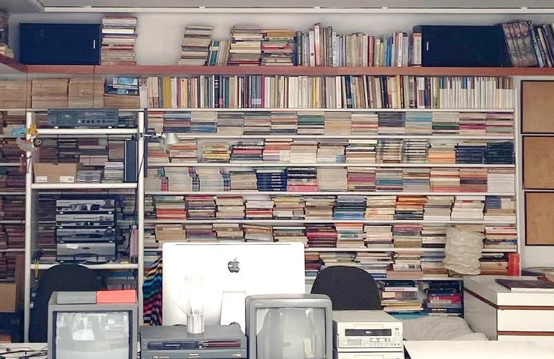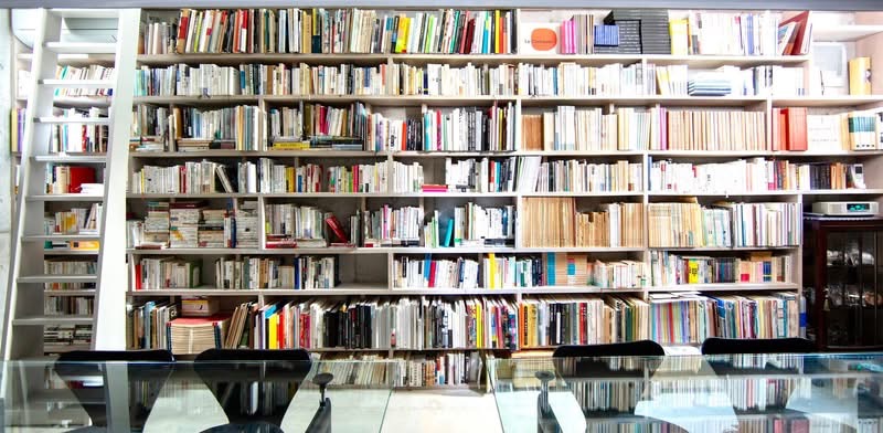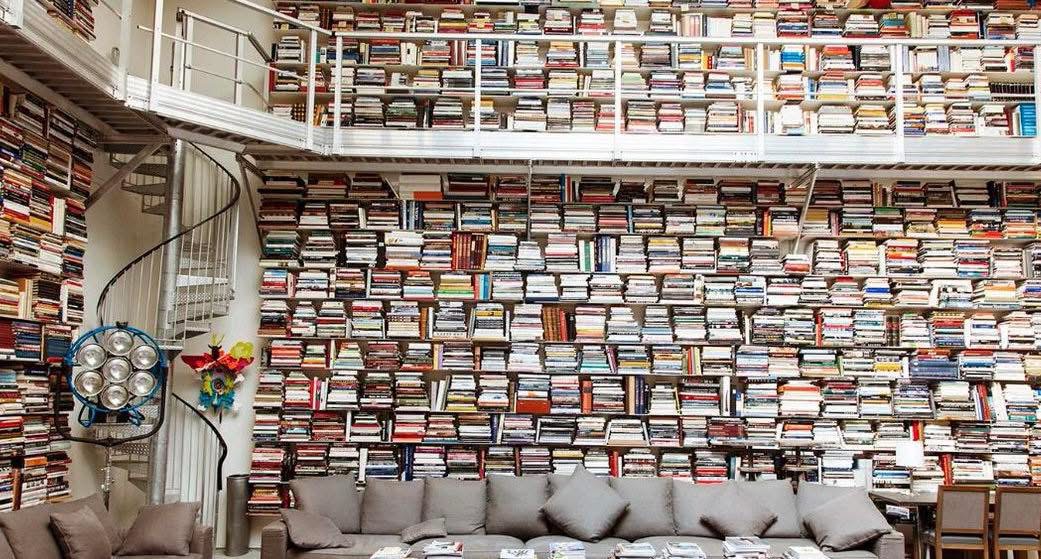 本は縦に置くのが普通だが入らなくなると横置きにする。拙宅では徐々に横置きになってきた。しかし世の中には最初から横置きにする人たちもいる。左下はカール・ラガーフェルド、右下はスペインの建築家フェルナンド・ミゲーラスの本棚。Lo normal es colocar los libros en vertical, pero cuando no hay más espacio, se colocan horizontalmente. En mi casa, los libros han empezado a colocarse horizontalmente poco a poco. Sin embargo, también hay quienes los colocan así desde el principio. La estantería de abajo a la izquierda es de Karl Lagerfeld, y la de abajo a la derecha es del arquitecto español Fernando Miguelas.