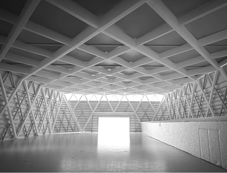 天井高さ10mの体育館のような工場とそれに併設する事務所棟の基本設計がほぼ終了した。斜めの線を頼りに二つの建物を縫合している。。 El diseño básico de la fábrica tipo gimnasio con un techo de 10 metros de altura y el edificio de oficinas adyacente está casi terminado.