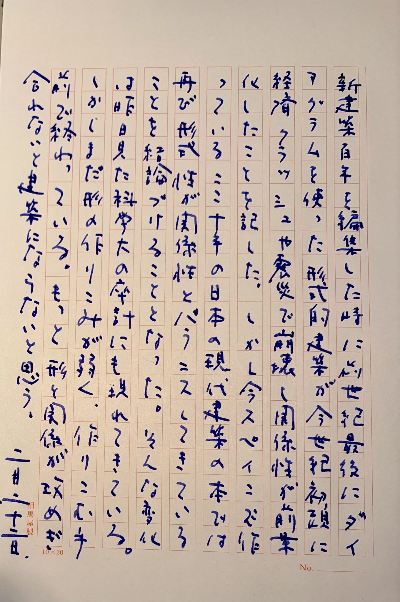 昨日大岡山建築賞選考会で鹿島デザインの北さんに会ったら『言葉と建築』を新入社員に読むように勧めていると言っていた。鹿島出版会の本だからと言うこともあるが、あの本の深さはみな理解している。今学会で作っている現代建築の問題群もあんな本になるといいのだが。Ayer conocí a Kita-san, de Kajima Design, en la reunión de selección del Premio de Arquitectura Ookayama, y me comentó que recomienda "Palabras y Arquitectura" a los nuevos empleados. Quizás sea porque es un libro de Kajima Publishing, pero todos parecen comprender su profundidad. Espero que la colección de preguntas sobre arquitectura contemporánea que el Instituto de Arquitectura de Japón está preparando también sea un libro similar.