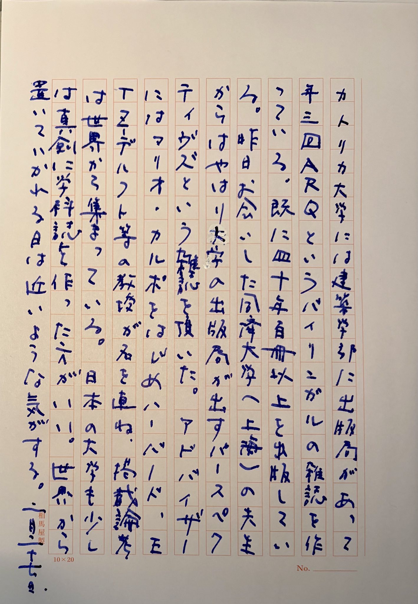 篠原一男の本が校了し来月店頭に並ぶ。この本は久しぶりに登山型の本である。結論に向かって一歩一歩登る展開だ。わたしの本では『建築の規則』はそのタイプ。他方ハイキング型という本もある。いろいろな場所を楽しく巡る展開である。『建築を見る技術』はそっちのタイプ。前者はより学術的な書き方と言える。しかし博士論文だった『建築の規則』ほど厄介なものではない。図面や写真も豊富でとっつきやすい工夫はいろいろしてある。手にとっていただければ幸甚である。El libro de Shinohara Kazuo ya está en imprenta y estará a la venta el próximo mes. Es el primer libro en mucho tiempo que sigue un estilo de escalada. Progresa paso a paso hacia una conclusión. Mis otros libros, "Las reglas de la arquitectura", son de este tipo. Por otro lado, también hay libros llamados de estilo senderismo. Progresan llevándote en un divertido viaje a diversos lugares. "El arte de mirar la arquitectura" es de este tipo. El primero puede describirse como un estilo de escritura más académico. Sin embargo, no es tan engorroso como "Las reglas de la arquitectura", su tesis doctoral. Contiene abundantes dibujos y fotografías, y se ha hecho un gran esfuerzo para que sea fácil de entender. Le agradecería mucho que consiguiera un ejemplar.