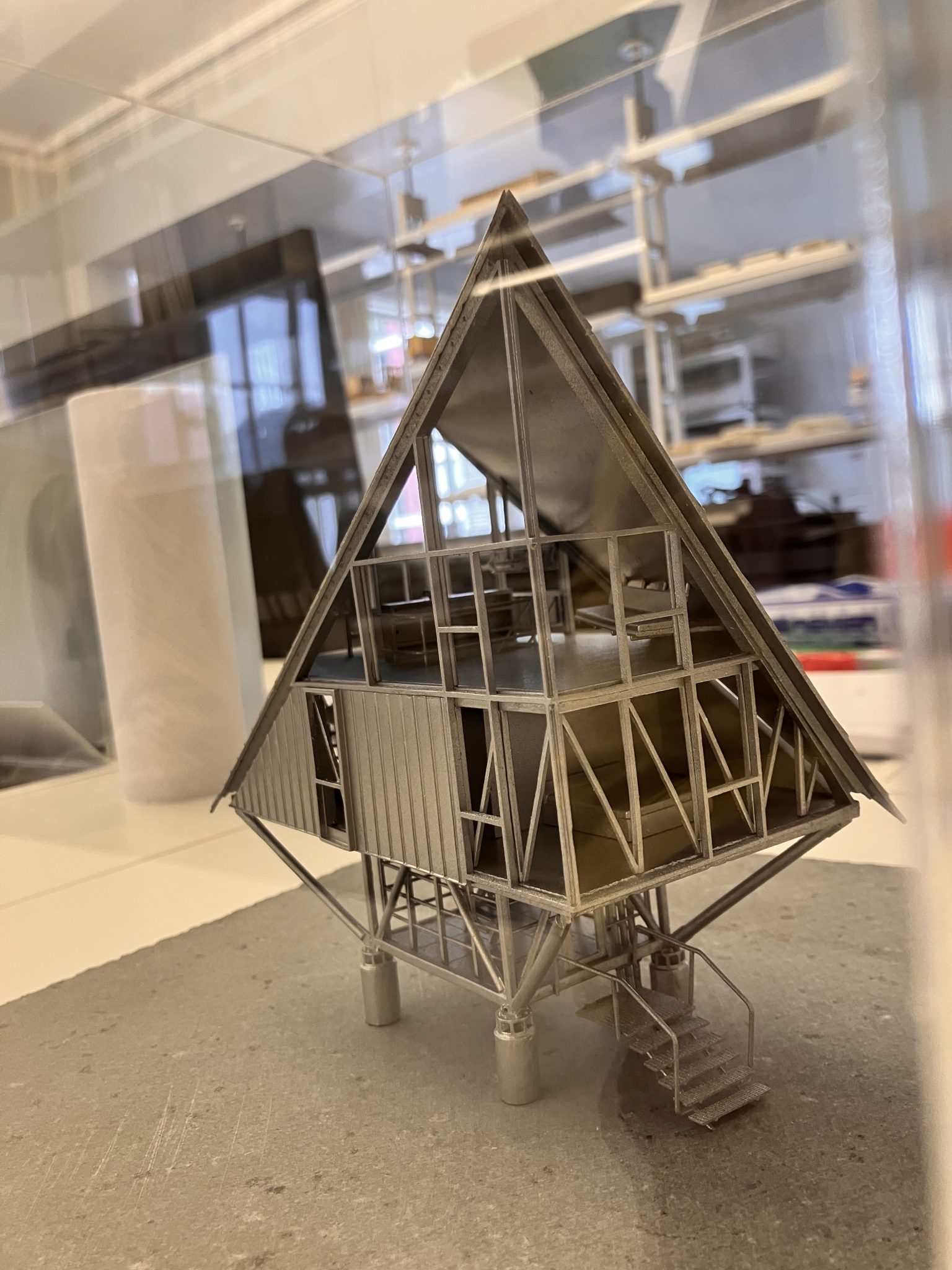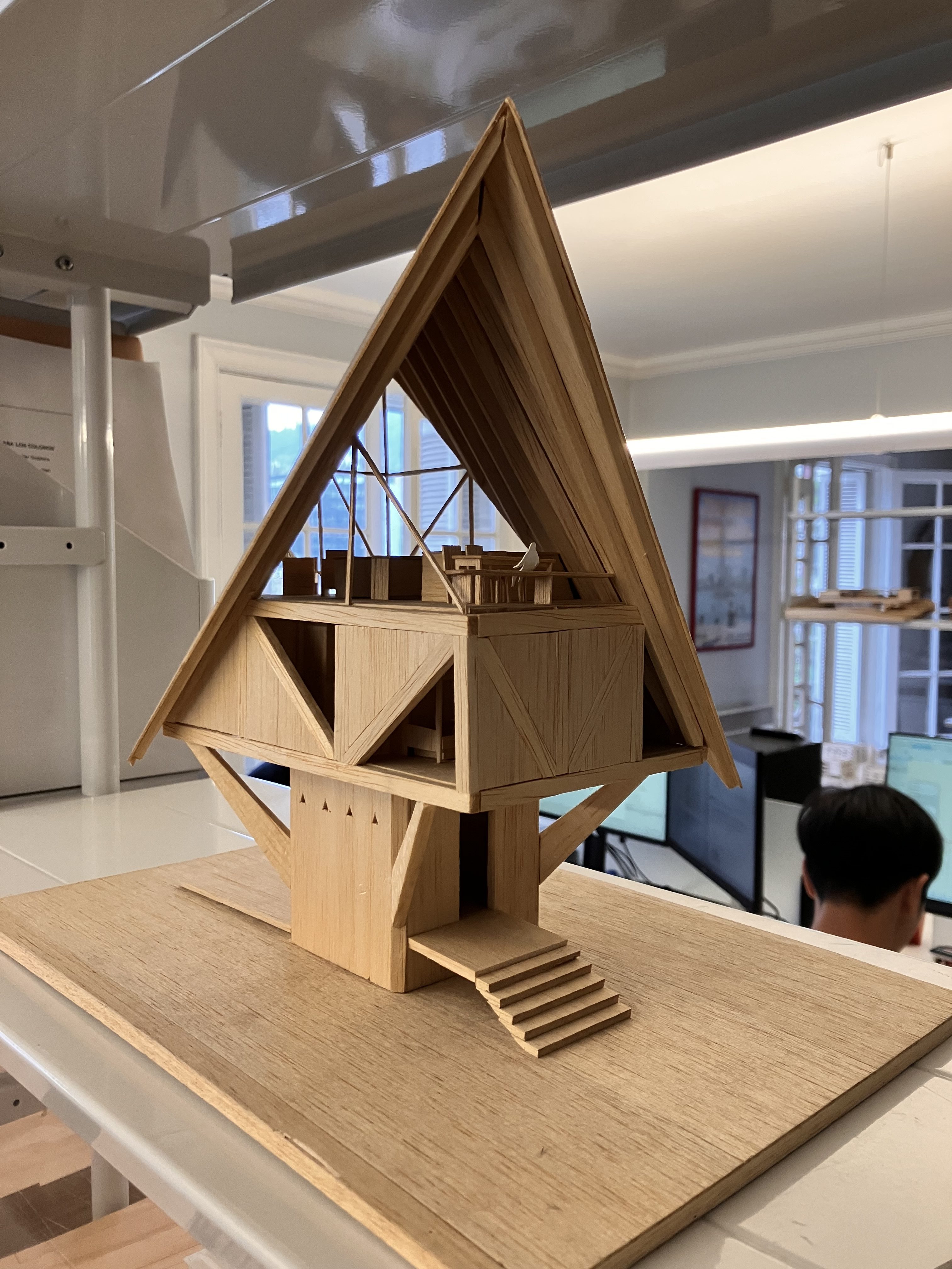 カトリカの先生でもあるマックス•ニュネスの事務所に行った。昔坂牛研の中村園花さんが働いていた時に担当したマックスの別荘の模型が丁寧に陳列されていた。そのそばにできた姿の模型がありその変化がよくわかる。マックスはだいの篠原ファンで本棚には日本建築コーナーがあり篠原図面集もあった。I visited the office of Max Nuñez, who is also a teacher at Catholic University. A model of Max's villa, which Sonoka Nakamura of the Sakaushi Laboratory was in charge of when she was working there, was carefully displayed. Next to it was a model of the completed building, which clearly showed the changes. Max is a huge Shinohara fan, and there was a Japanese architecture section on his bookshelf, including a collection of Shinohara drawings.