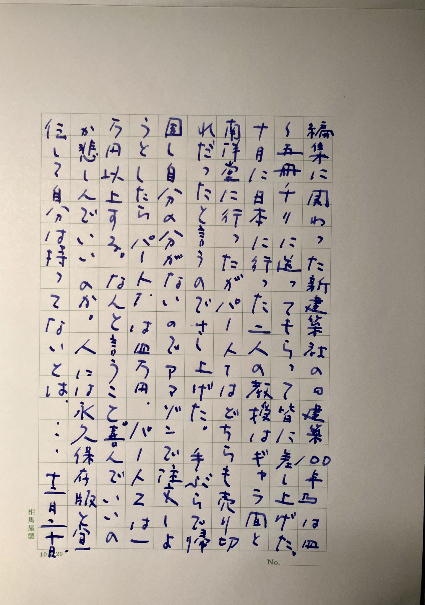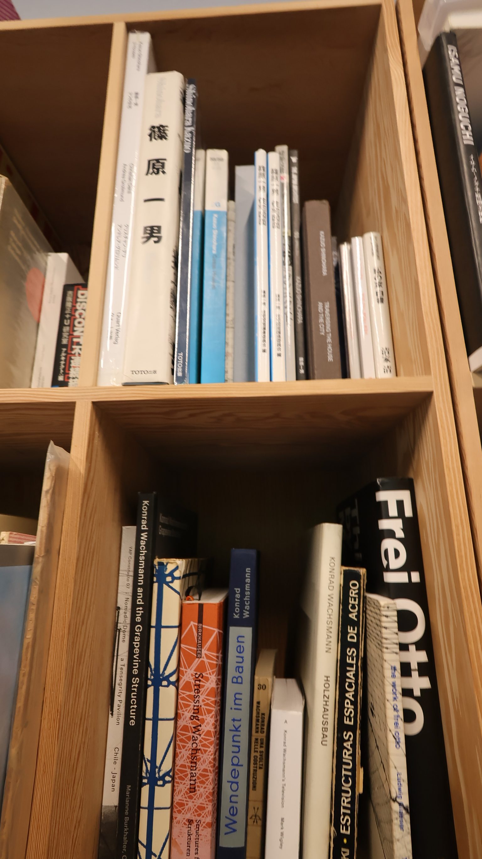 スミルハンに帰りの挨拶をしに行った。今本棚の本書いていると言ったらぜひ自分のデザインを見てと言われて彼の地下のオフィスに行った。 すると20センチ×30センチの箱が6つコンバインされたものを一つのユニットとしてそれを組み合わせた本棚だった。これは一つのサイズを縦横に使うことでほとんどの本を収納できるサイズ。見事なサイズ設定。一区画オール篠原一男の本があった。 I went to say goodbye to Smilhan as I was leaving. When I told him I was currently working on a book about bookshelf, he asked me to come and see his design so we went to down to his basement office. I found a bookshelf made up of six 20cm x 30cm boxes combined into one unit. By using one size vertically and horizontally, it is large enough to store most books. An amazing size. One section was filled with all of Shinohara Kazuo's books.