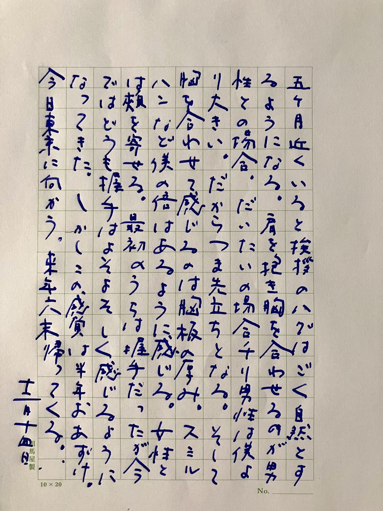 チリから帰ったら一番ミスするのは毎朝のいい空気の散歩。次は果物。三つ目は広い自宅。半年後に戻ると思うとお名残惜しいという気にならない。ところで日本の何かをミスしているのだろうかと考えてもそれもそんなにはない。半年というのがいい時間なのだと思う。 The thing I'll miss most when I return from Chile is my morning walk in the fresh air. Next would be fruit. The third thing would be a spacious home. I'll be back in six months, so I'm not too sad about leaving. By the way, when I think about whether I'm missing something about Japan, it's not that much. I think six months is a good amount of time.