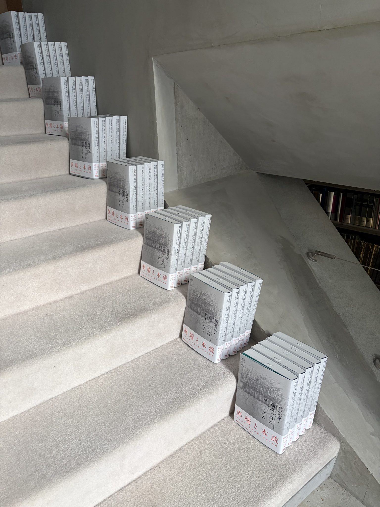 昨日届いた近著を開梱し階段に並べ自己満足に浸っている。次の本『本棚』が編集会議を通過したので本格的に取り掛かろうと思う。昨日からタイトルを考えているがうまく言い表せない。I unpacked my latest book, which arrived yesterday, and lined it up on the stairs, basking in self-satisfaction. My next book, "Bookshelf," has passed the editorial meeting, so I'm going to get to work on it in earnest. I've been thinking about the title since yesterday, but I can't quite put it into words.